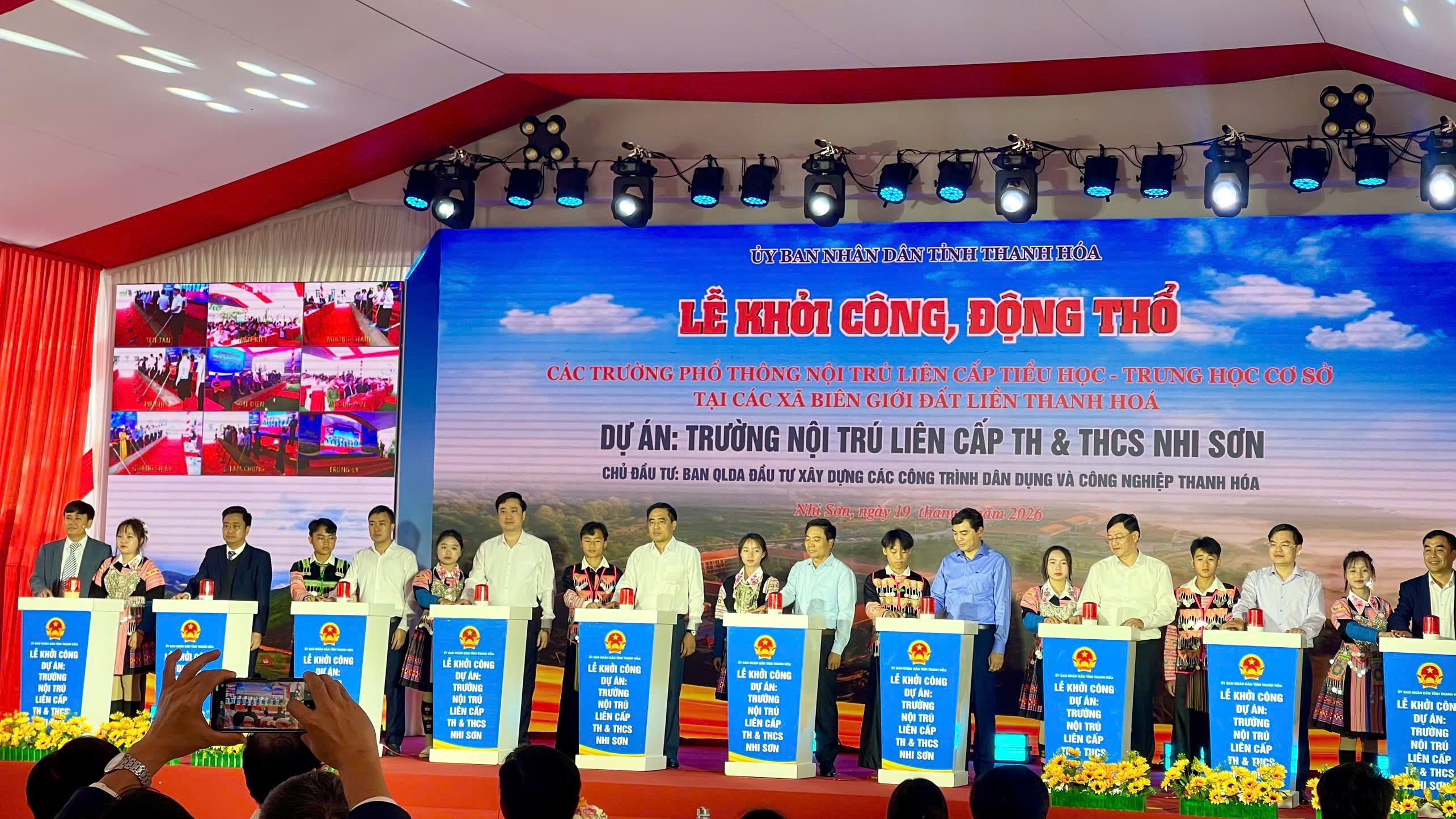 Tại buổi lễ, các đồng chí lãnh đạo tỉnh và đại diện lãnh đạo Trung ương, địa phương đã thực hiện nghi thức nhấn nút khởi công Trường phổ thông nội trú liên cấp Tiểu học và Trung học cơ sở Nhi Sơn.